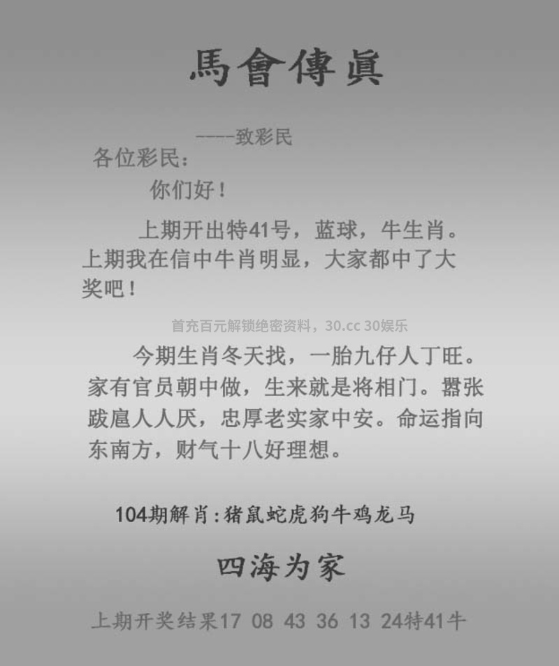 104期:平特复式{10}{马12}{龙02}{牛17}